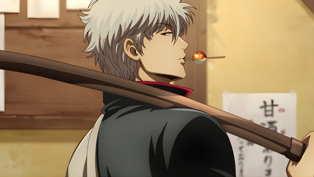 As cenas divulgadas de Gintama: The New Movie – Yoshiwara in Flames incluem Gintoki de perfil e com olhar penetrante, segurando um bolinho e carregando uma espada de madeira no ombro.